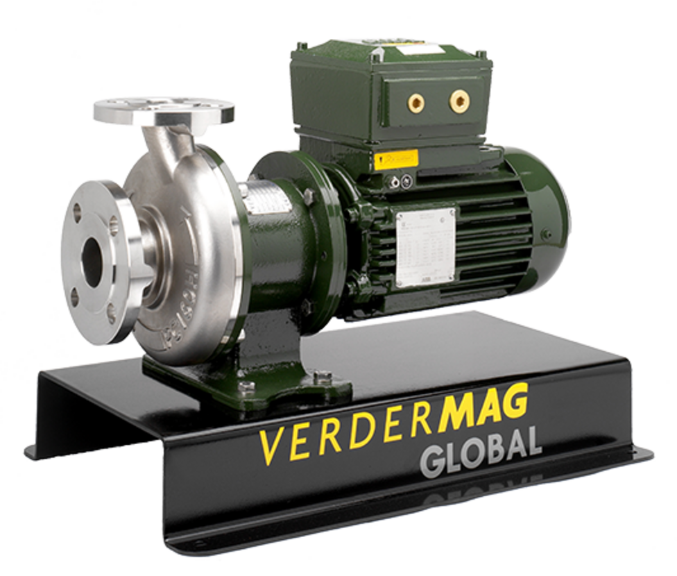 Verdermag Global metallic centrifugal pumps are synchronous magnet-driven seal-less pumps. The motor drives the pump shaft which rotates the outer magnet. The outer magnet 'pulls' an inner magnet, exploiting the polarities in each of the magnet units. The inner magnet then rotates the impeller, creating a centrifugal flow of fluid into the process line.