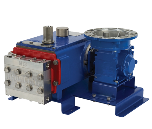 The Verderbar Hydra-Cell MT8 Triplex Metering Pump is the optimal choice for applications that require precise dosing of the smallest flow rates under high pressure. The piston diaphragm pump impresses with its outstanding dosing accuracy and excellent control options, which not only meets but exceeds the performance criteria of API 675. With its robust and compact design, it can be regulated to up to 0.227 l/h at a maximum pressure of 241 bar. Their compact design together with the three diaphragms ensures a smooth, almost pulsation-free flow.Perishable metering pumps are based on the proven Hydra-Cell principle. They offer unmatched accuracy, repeatability (± 1%) and linearity (± 1%), while ensuring precise and consistent dosing (± 0.5%). They are suitable for conveying corrosive, non-lubricating and abrasive fluids and can even run dry without damage. They are used in the oil and gas industry, paper industry, high-pressure cleaning, dosing tasks, reverse osmosis and in car washes, among others.